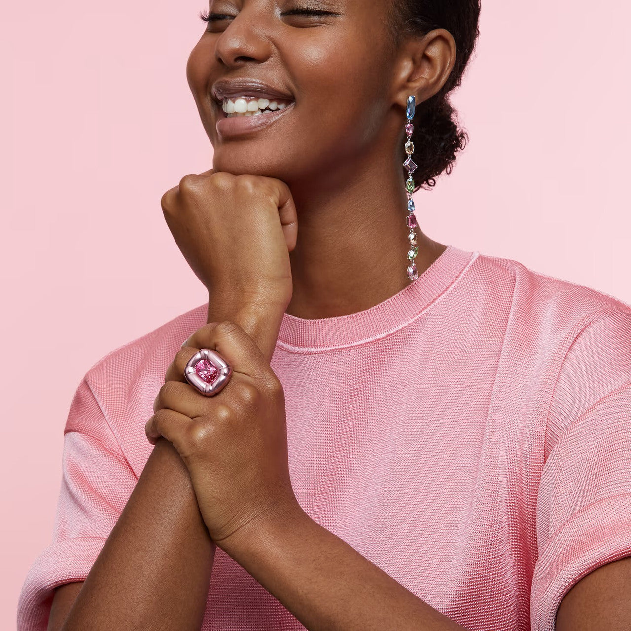 These extra-long multicolored drop earrings feature a mix of oval, pear, emerald and navette cut crystals, which fall to shoulder-grazing length. An elegant yet playful twist on the essence of Swarovski crystals, wear yours with an off-the-shoulder top to highlight their kaleidoscopic color and kinetic craftsmanship. These earrings are part of the Gema family, designed by Creative Director Giovanna Engelbert for Collection I.