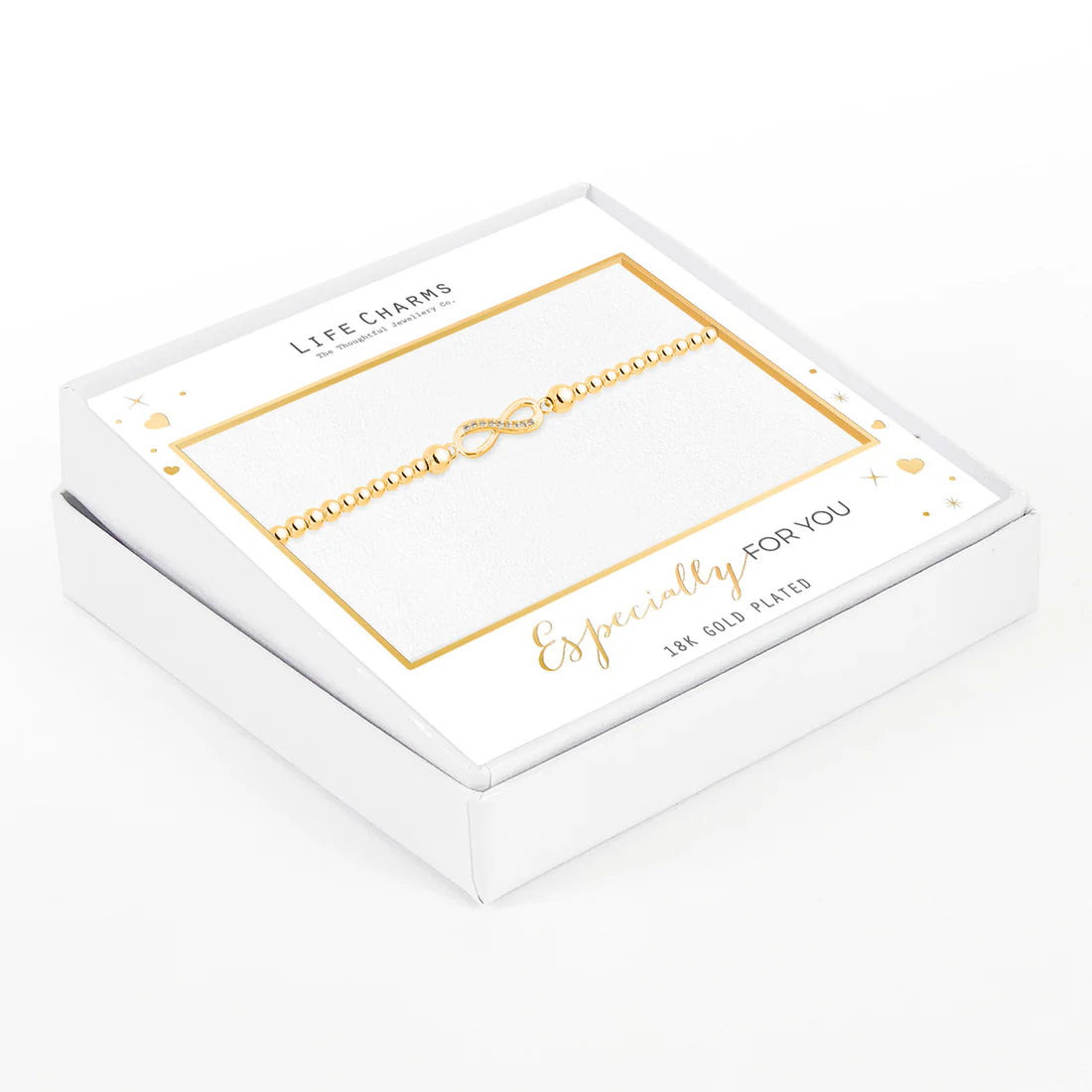 Beautiful beaded bracelet with infinity charm with cz stone crafted in gold with attention to detail and aesthetic appeal. To add to the luxury experience, each piece of jewellery includes a complimentary gift box.