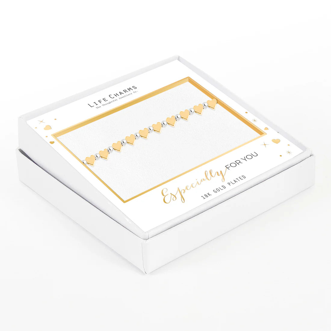 Beautiful beaded bracelet with small heart charms between beads crafted in silver and gold with attention to detail and aesthetic appeal. To add to the luxury experience, each piece of jewellery includes a complimentary gift box.