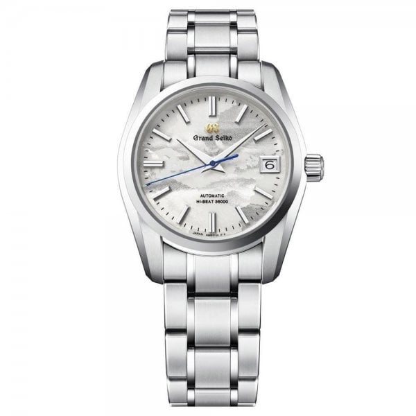 The 9S family of movements are crafted in Shizukuishi, the spiritual home of Grand Seiko mechanical watchmaking. Known for its bucolic vistas and breathtaking landscape, the towns name is appropriately poetic. It translates to water dripping on stone. The scenic beauty is further enhanced by nearby Mt. Iwate, an imposing, snow-capped peak that emerges from surrounding clouds at daybreak. The contours of these clouds inspire the SBGH311s silver-colored dial in a dramatic effect brought to life through the Grand Seikos skill and advanced manufacturing techniques. On the back, a titanium oscillating weight completes the vivid scene with a sky-blue color achieved through anodic oxidation.