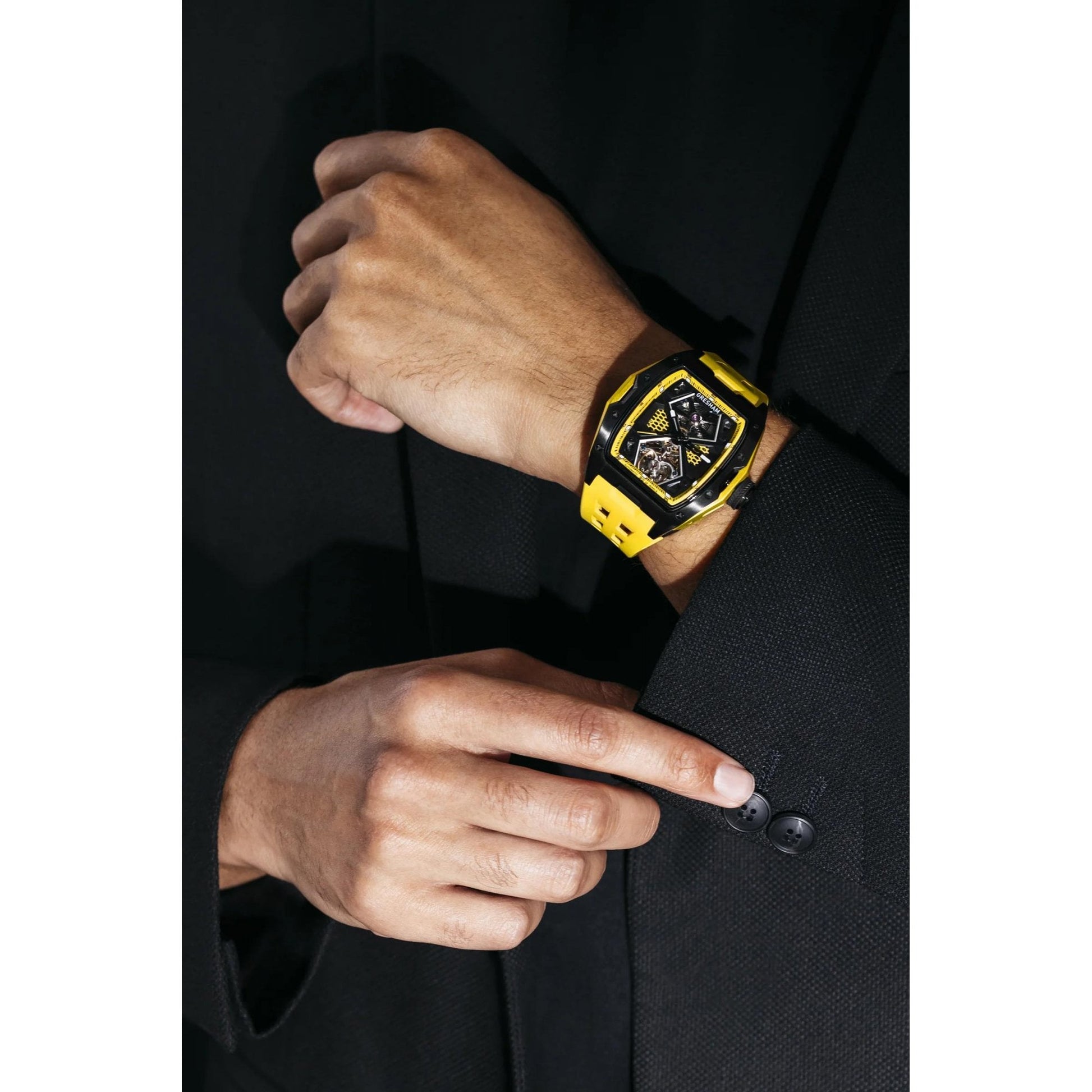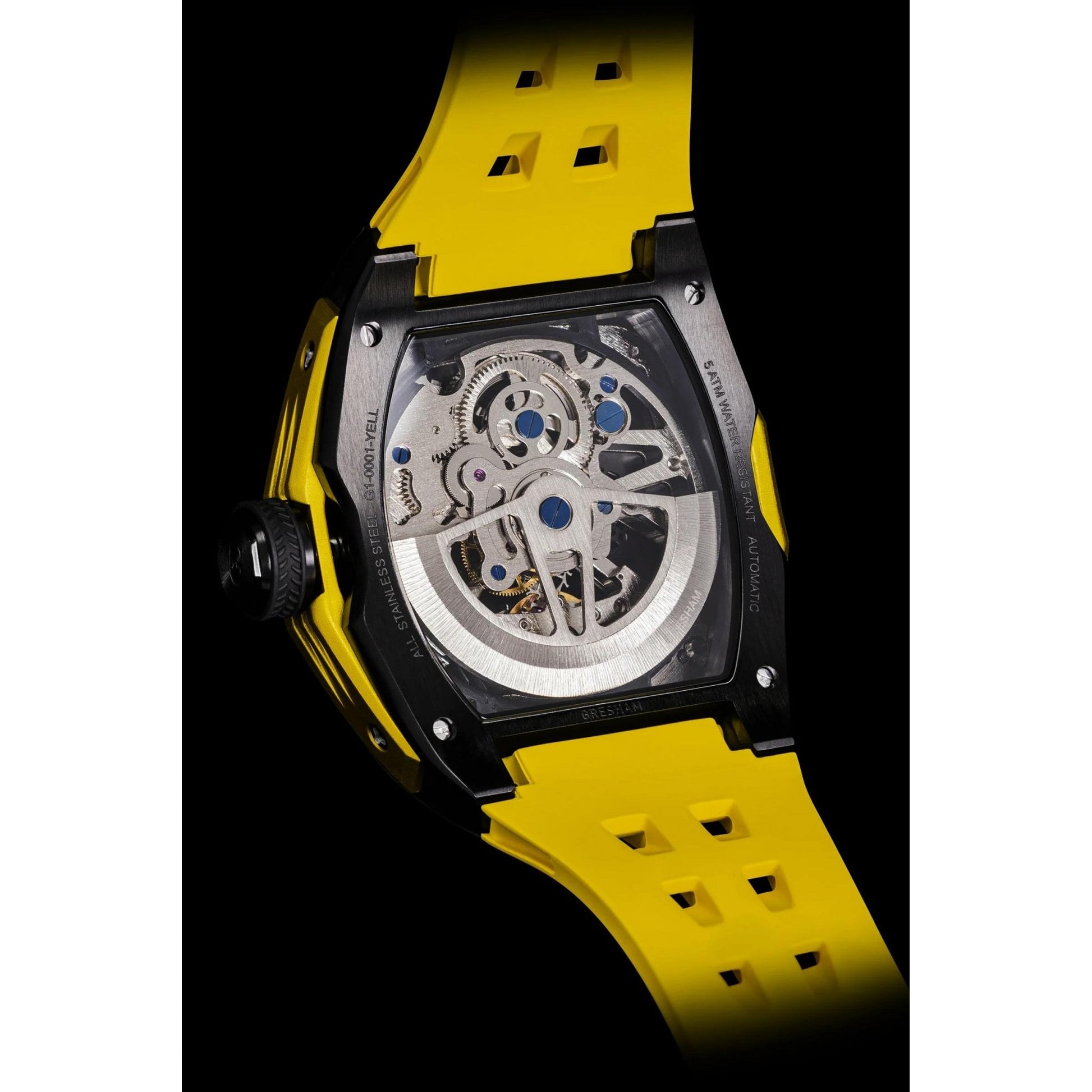 The Genesis GI Features a hybrid Steel and Aluminium Exo frame chassis which embodies the exposed skeleton custom automatic movement with self-winding mechanism. The case is seamlessly integrated on a custom designed high density rubber strap.