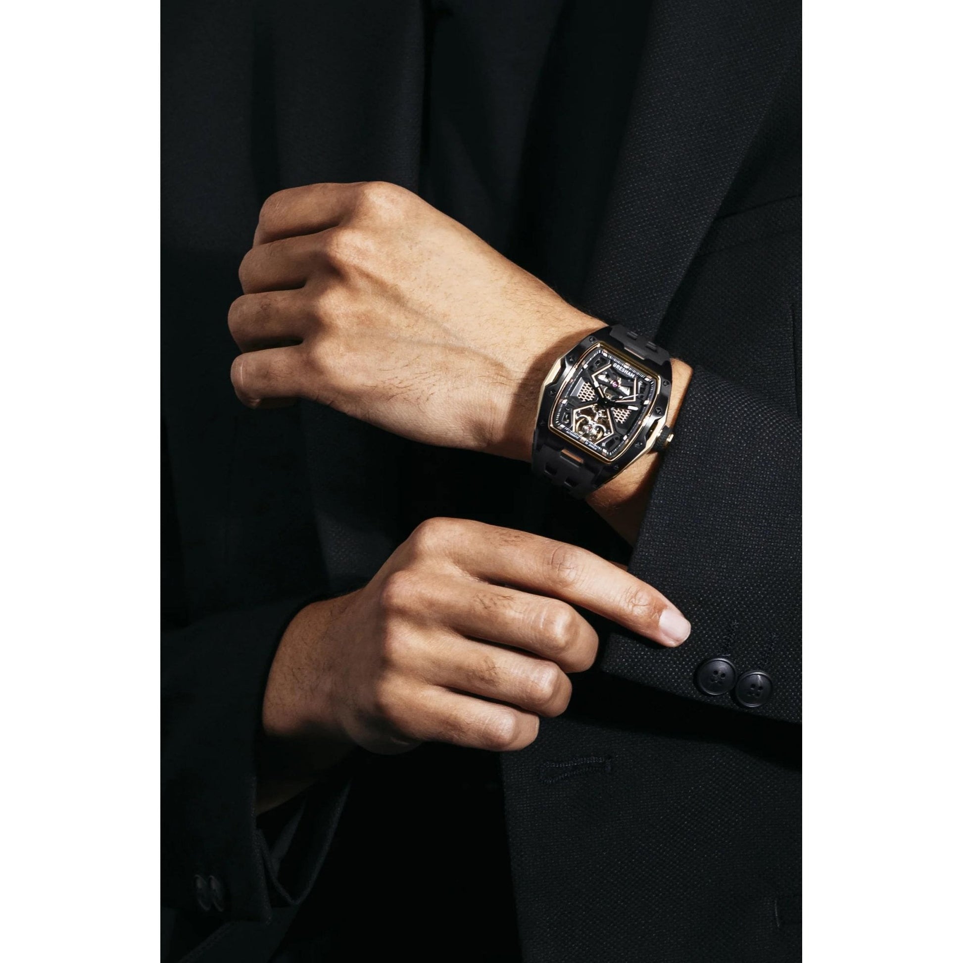 The entire 45mm case curves effortlessly front and back and features the multi forged stainless steel curved case back with exhibition window.