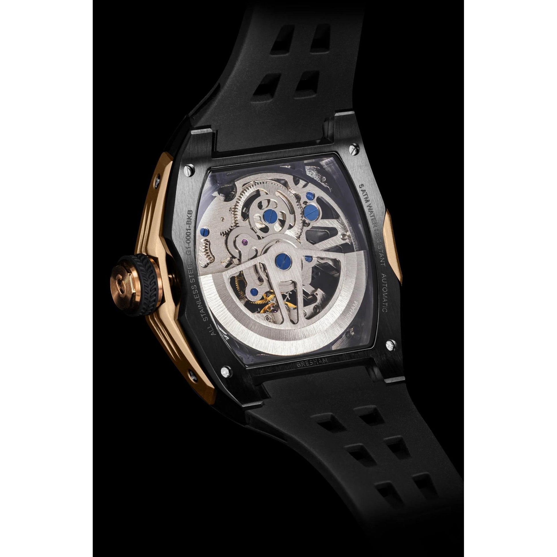 The Genesis GI Features a hybrid Steel and Aluminium Exo frame chassis which embodies the exposed skeleton custom automatic movement with self-winding mechanism. The case is seamlessly integrated on a custom designed high density rubber strap.