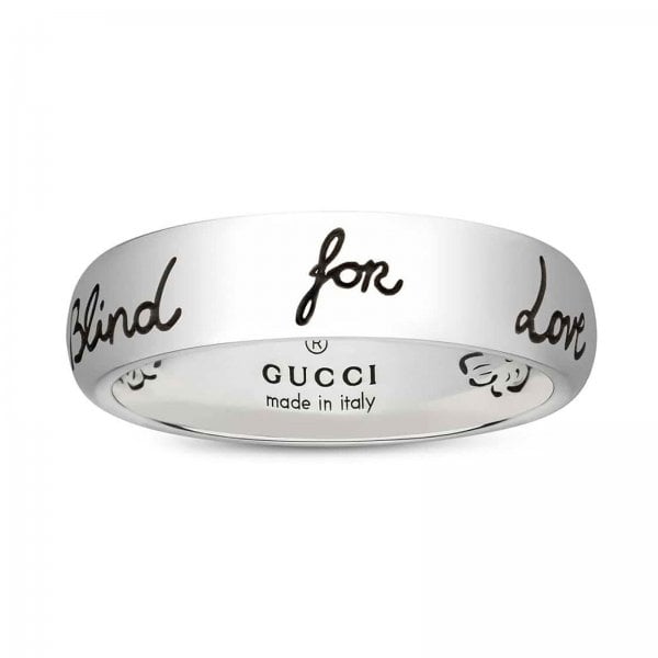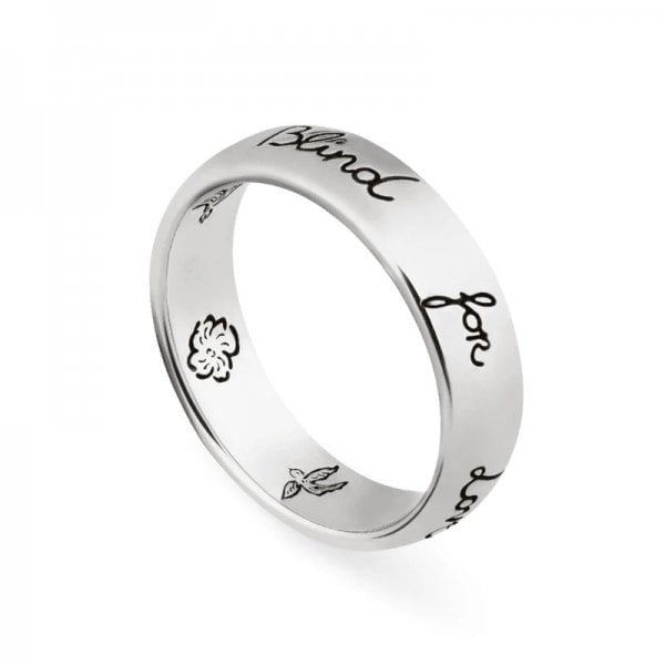 A thin ring in silver featuring engraved with symbolic Gucci motifs, including the eye, hearts, birds, flowers and interlocking G.