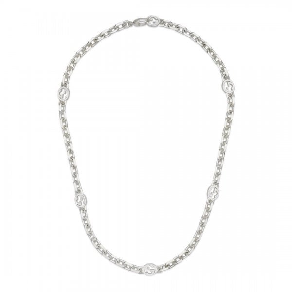 Crafted from sterling silver, the Gucci Interlocking Necklace showcases multiple signature Interlocking motifs for a timeless and refined look. The delicate anchor chain design measures 50cm in length, making it a versatile statement piece for any occasion.