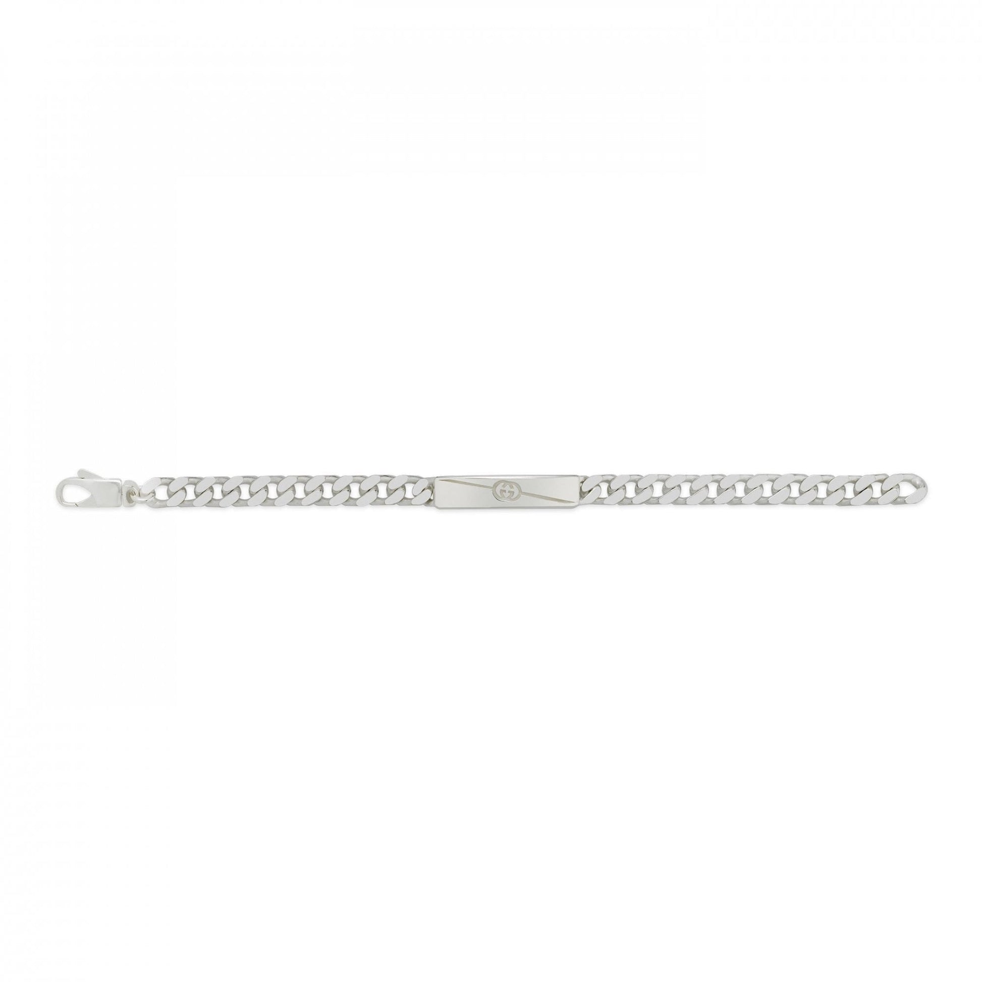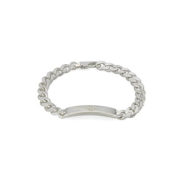 Crafted from polished 925 sterling silver, this bracelet features a sleek, elongated tag pendant engraved with the iconic GUCCI logo. Its minimalist design and secure clasp closure make it a versatile piece that can be worn alone or layered with other bracelets for a personalised look. Whether dressing up for a special occasion or adding a touch of luxury to your everyday ensemble, this bracelet offers timeless elegance and refined style.