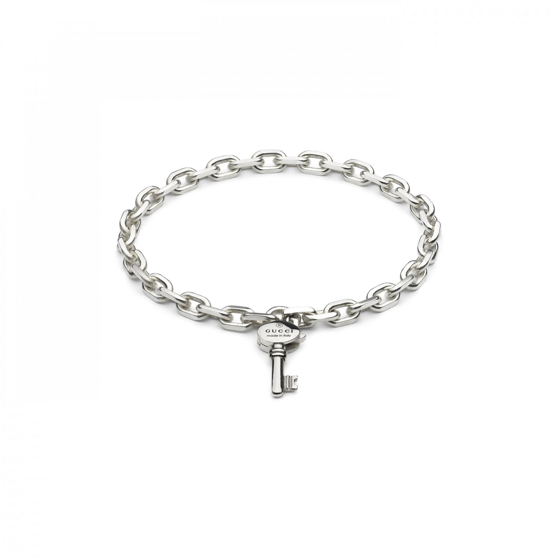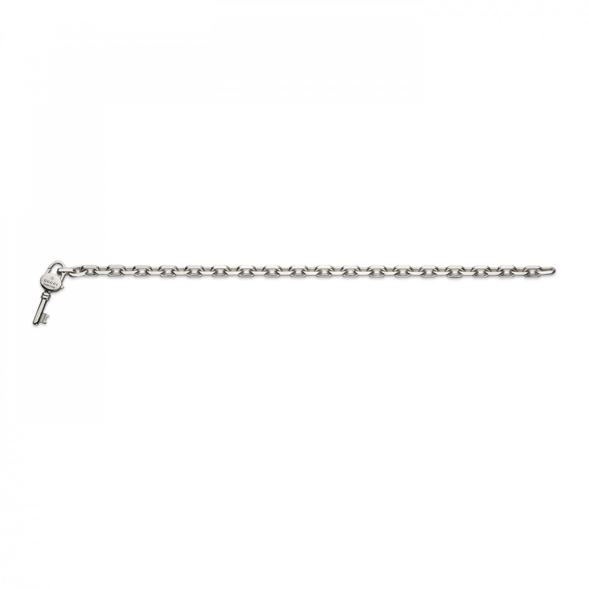 Unlock effortless elegance with this GUCCI Trademark Key Bracelet. Crafted in polished sterling silver, it features a refined chain accented by a key‑motif charm that echoes GUCCI’s playfulness and heritage. Whether you wear it solo for subtle shine or layer it with other pieces for impact, it brings a timeless touch of luxury to any look