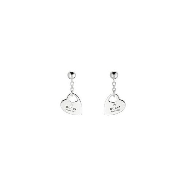 The Gucci Trademark line combines motifs and hexagonal charms with the name of the House. From the cut-out heart to the padlock charm, playful symbols continue to distinguish a selection of rings, necklaces, bracelets and earrings for Pre-Fall 2024. These drop earrings feature a cut-out heart within the heart charm.