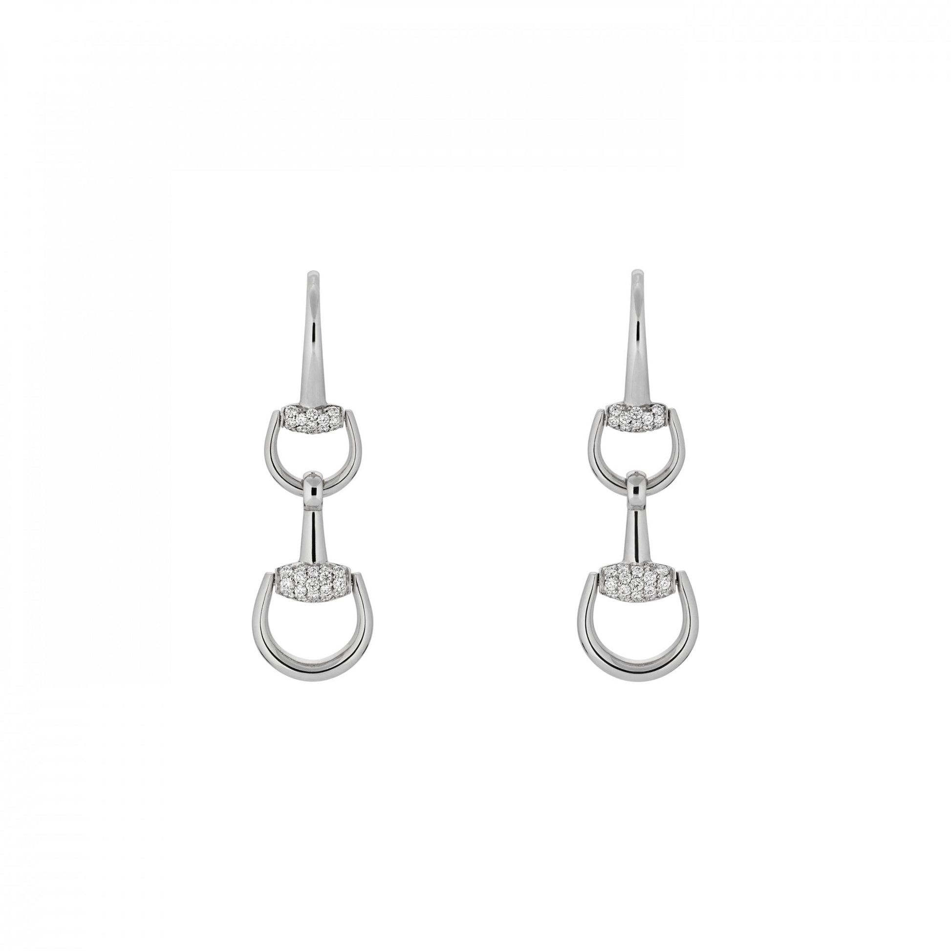 An extension of the Horsebit range includes eye-catching diamonds across a selection of white and rose gold jewelry pieces. This pair of 18k white gold earrings features pavé diamonds atop two Horsebit details.