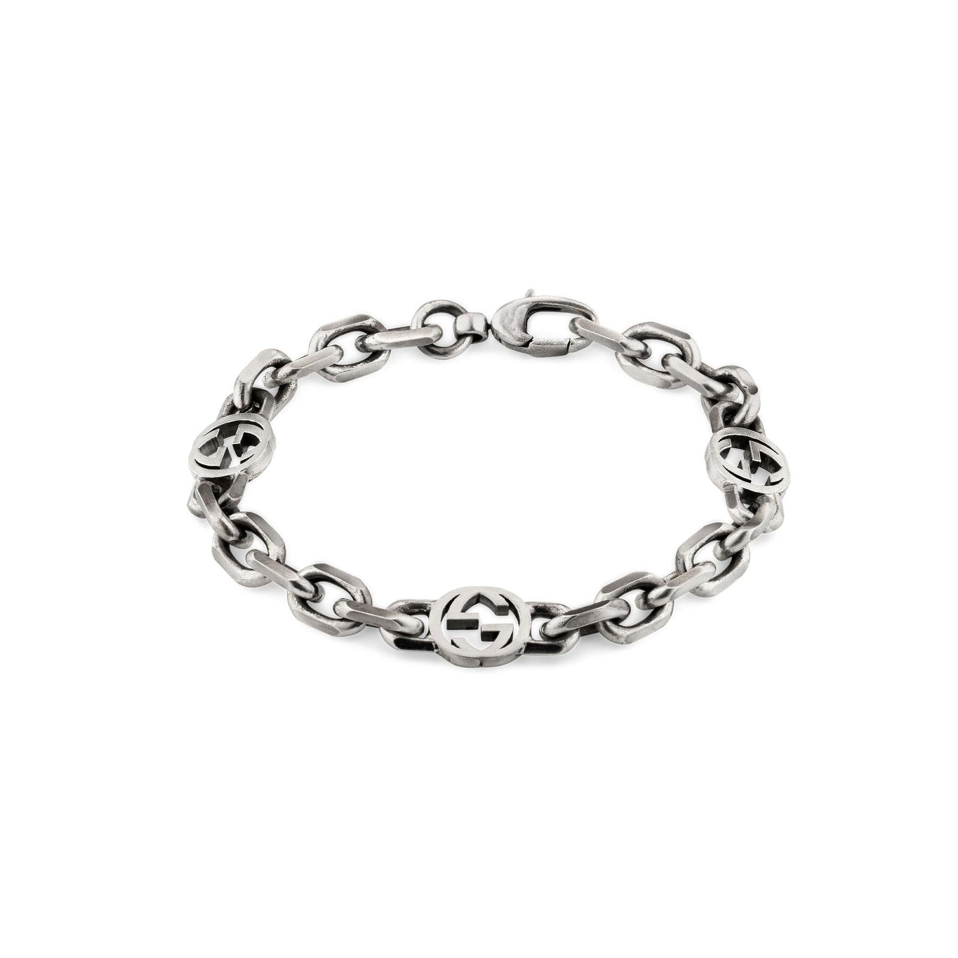 Crafted from silver with an aged finish, this chain bracelet is defined by the Interlocking G. A symbol from the House's archives, the monogram detail pays homage to the brand's founder, Guccio Gucci, while adding a subtle logo connotation.