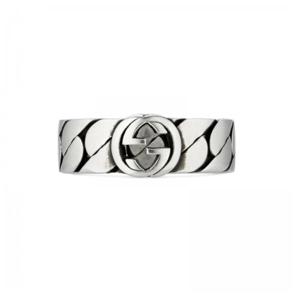 Crafted from polished 925 sterling silver, this 6mm band ring features Gucci’s iconic Interlocking G motif, symbolizing the brand's rich heritage and timeless design. Its clean, minimalist aesthetic makes it a versatile piece that can be worn solo for a statement look or stacked with other rings for added flair. Whether you're dressing up or down, this ring adds a touch of luxury to any ensemble.