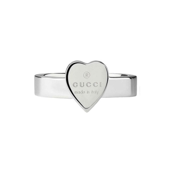Gucci Trademark heart shaped ring is made from sterling silver and features the icon Gucci trademark. Width 3.5mm. Heart Size 9.80mm x 8.30mm.
