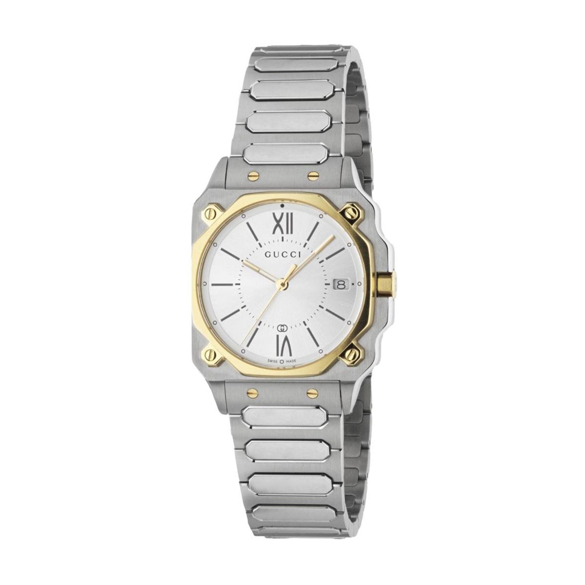 30mm stainless steel case with 18kt gold-plated bezel and screws; Silver galvanized dial with roman indexes at 12 and 6 o’clock and date at 3 o'clock; Stainless steel bracelet