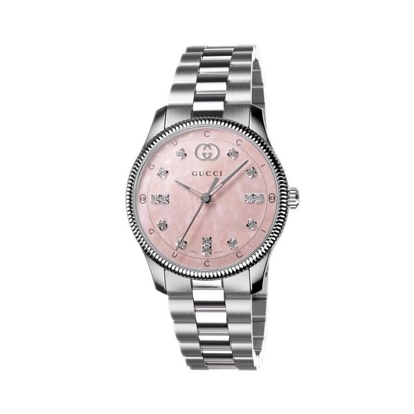 29 mm stainless steel case, pink mother of pearl dial with Interlocking G and Gucci lettering, diamond indexes, stainless steel bracelet