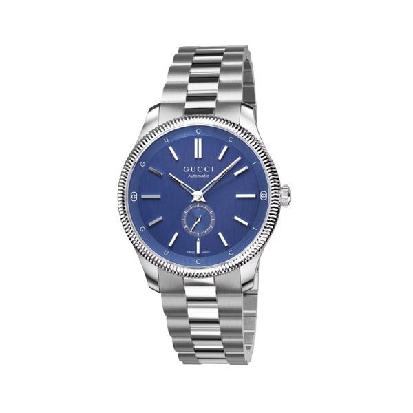 Stainless steel case, blue dial with Interlocking G and Gucci lettering, small seconds display, stainless steel bracelet