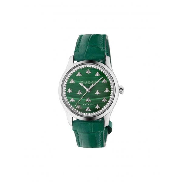 The G-Timeless collection continues to explore emblematic House codes in new ways each season. This automatic watch is designed with a green malachite stone dial, paired with a green alligator leather strap. The emblematic bee motif enriches the style.