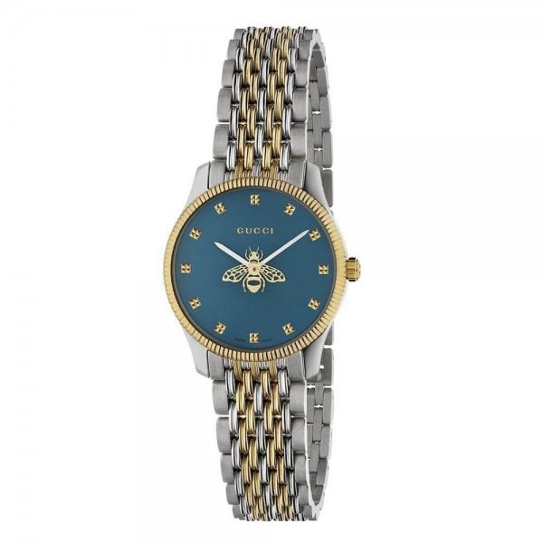The G-Timless collection continues to explore emblematic House codes in new ways each season. A recognisable Gucci symbol, the bee appears as a subtle detail atop this watch. The accessory's blue dial is paired with a steel and gold PVD bracelet to add a delicate feel.