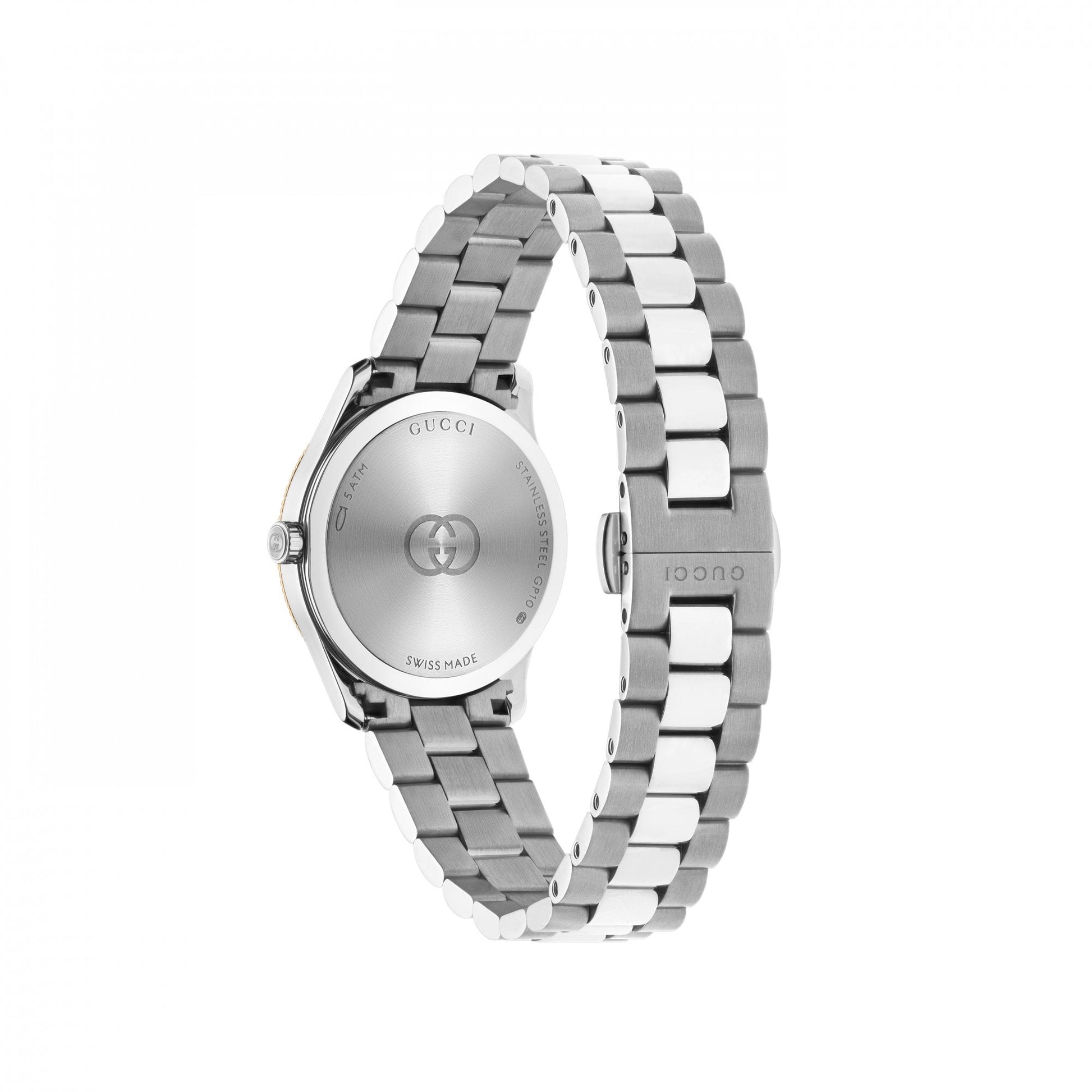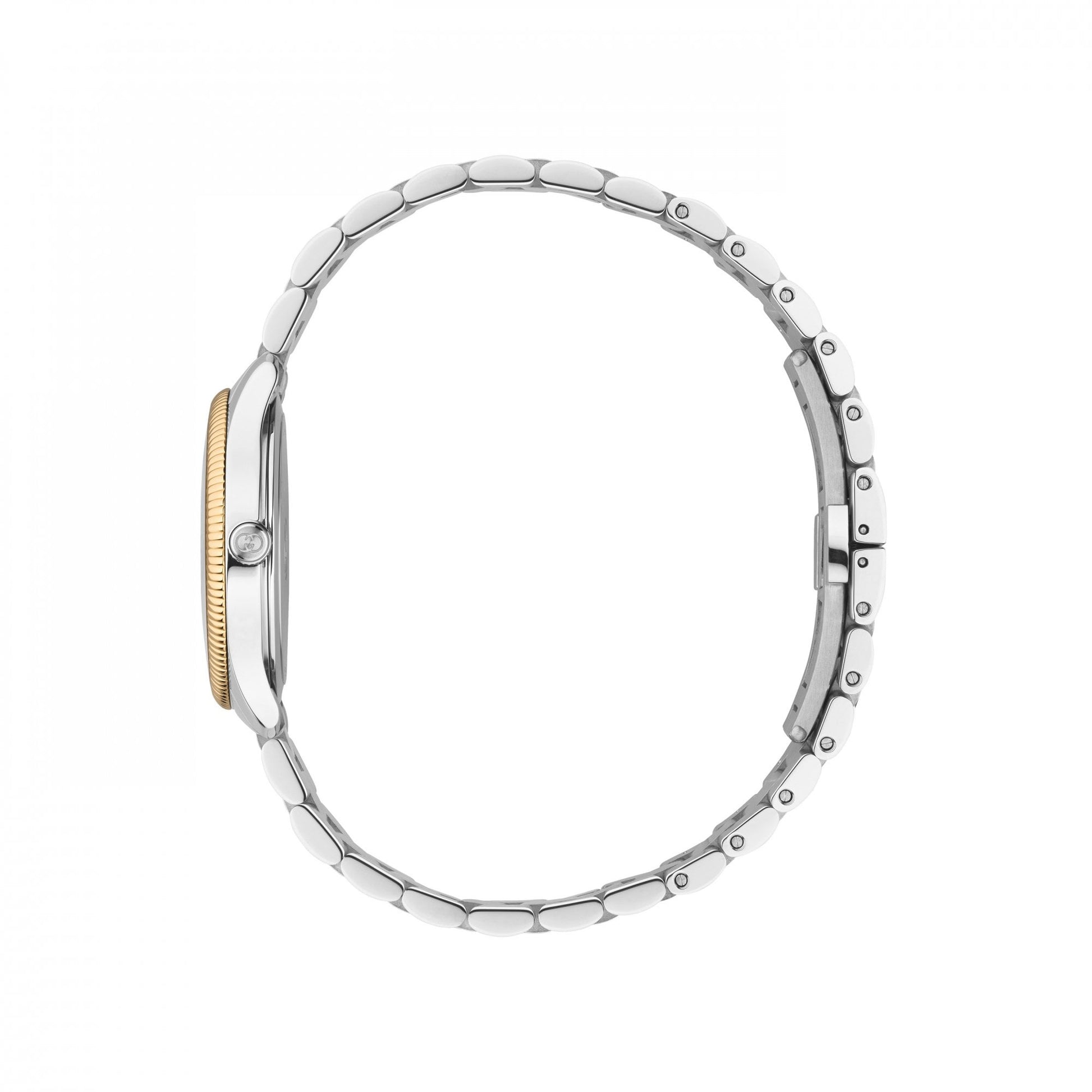 29 mm stainless steel case, pink gold-plated bezel, silver dial, stainless steel bracelet, quartz movement