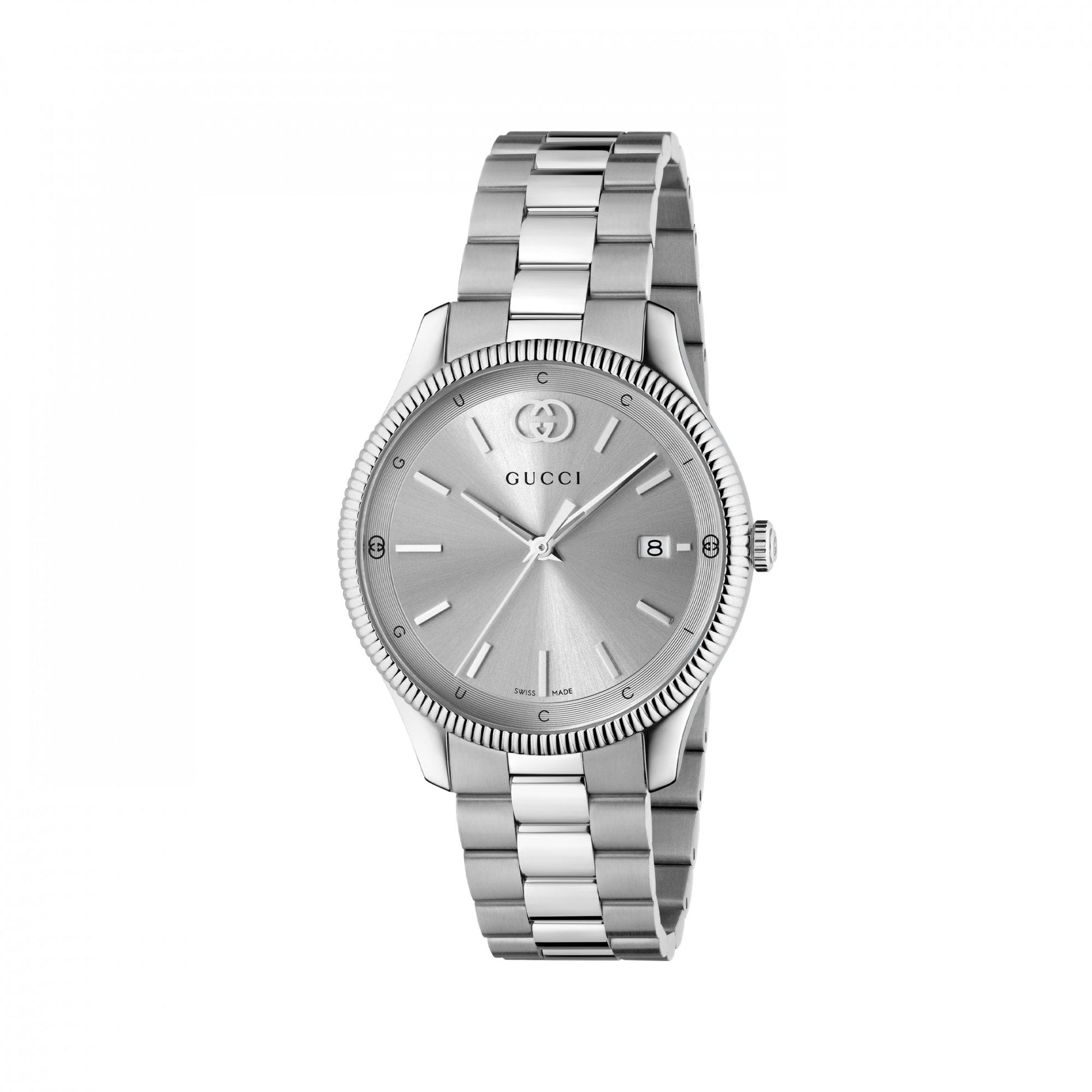 38mm stainless steel case, silver-toned dial with Interlocking G, date at 3 o' clock and stainless steel bracelet