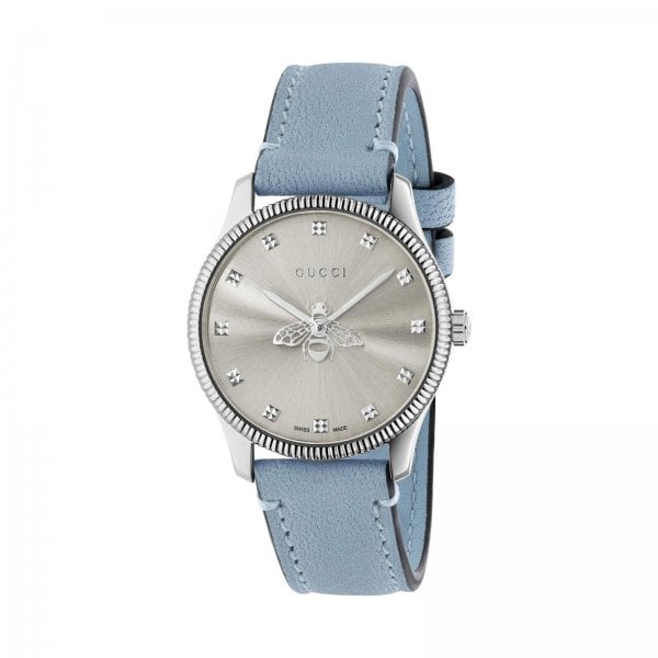The G-Timeless collection continues to explore emblematic House codes in new ways each season. A recognisable Gucci symbol, the bee appears as a subtle detail atop this watch. The style in silver-toned sun-brushed dial is paired with a light blue leather strap.