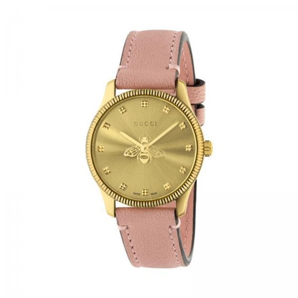 The G-Timeless collection continues to explore emblematic House codes in new ways each season. A recognisable Gucci symbol, the bee appears as a subtle detail atop this watch. The style in golden sunbrushed dial is paired with a light pink leather strap.