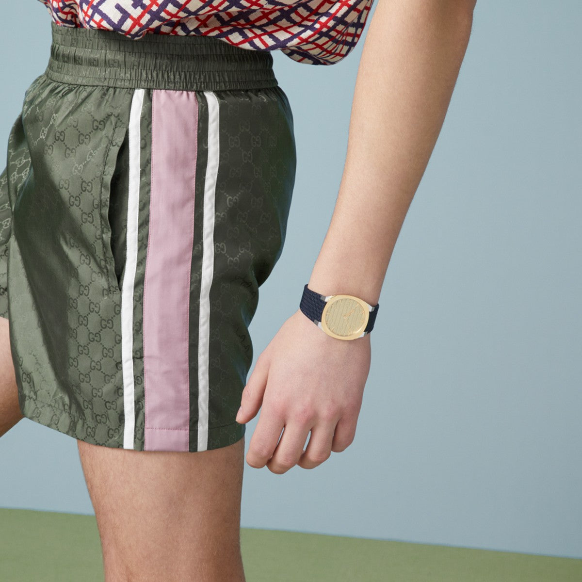 The brushed gold-tone dial features subtle horizontal engraving and GUCCI’s signature branding, creating a clean yet distinctive look. Ultra-slim in profile and inspired by the streamlined forms of contemporary architecture, the 25H offers a refined silhouette that effortlessly complements both formal and casual wear.