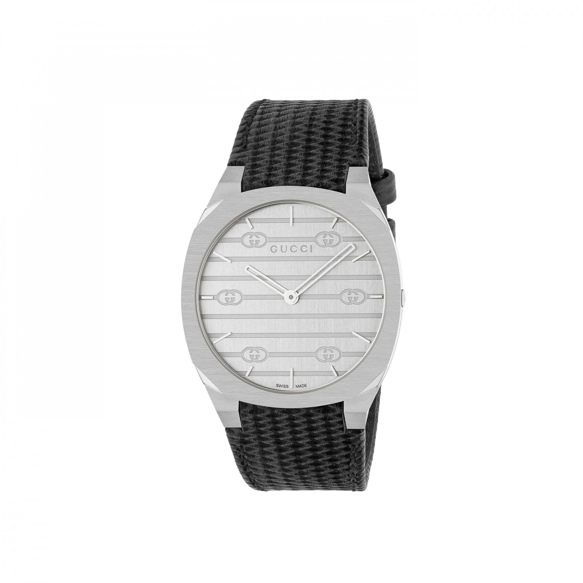 38 mm stainless steel multi layered case, silver brass dial with Interlocking G, black leather strap