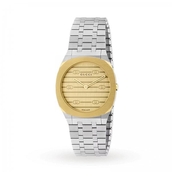 The GUCCI 25H's streamlined silhouette was inspired by the sleek forms of contemporary architecture. The watch is presented with a thin multi-layer case and five-link steel bracelet, while the design is completed by monogram details and a gold-toned dial. The name, GUCCI 25H, is attributed to a particularly symbolic talisman for Creative Director Alessandro Michele.
