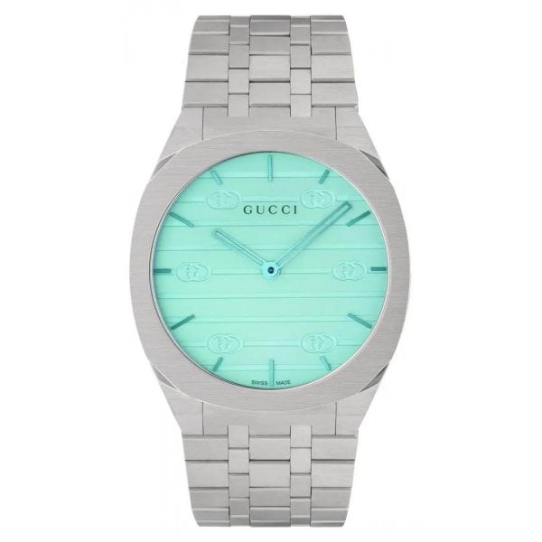 The GUCCI 25H's streamlined silhouette was inspired by the sleek forms of contemporary architecture. The watch is presented with a thin multi-layer case and five-link steel bracelet, while the design is completed by blue glass and an Interlocking G motif. The name, GUCCI 25H, is attributed to a particularly symbolic talisman for Creative Director Alessandro Michele.