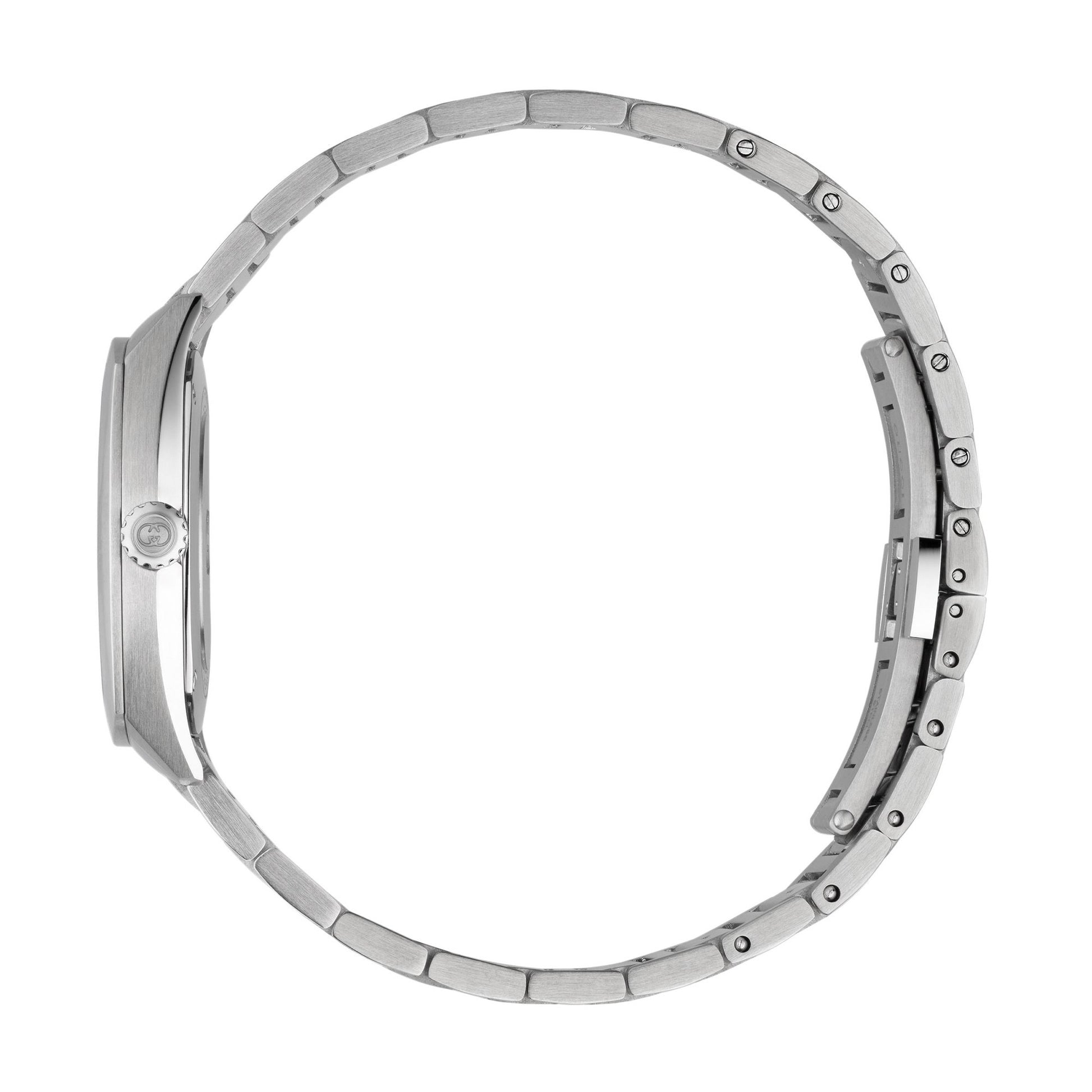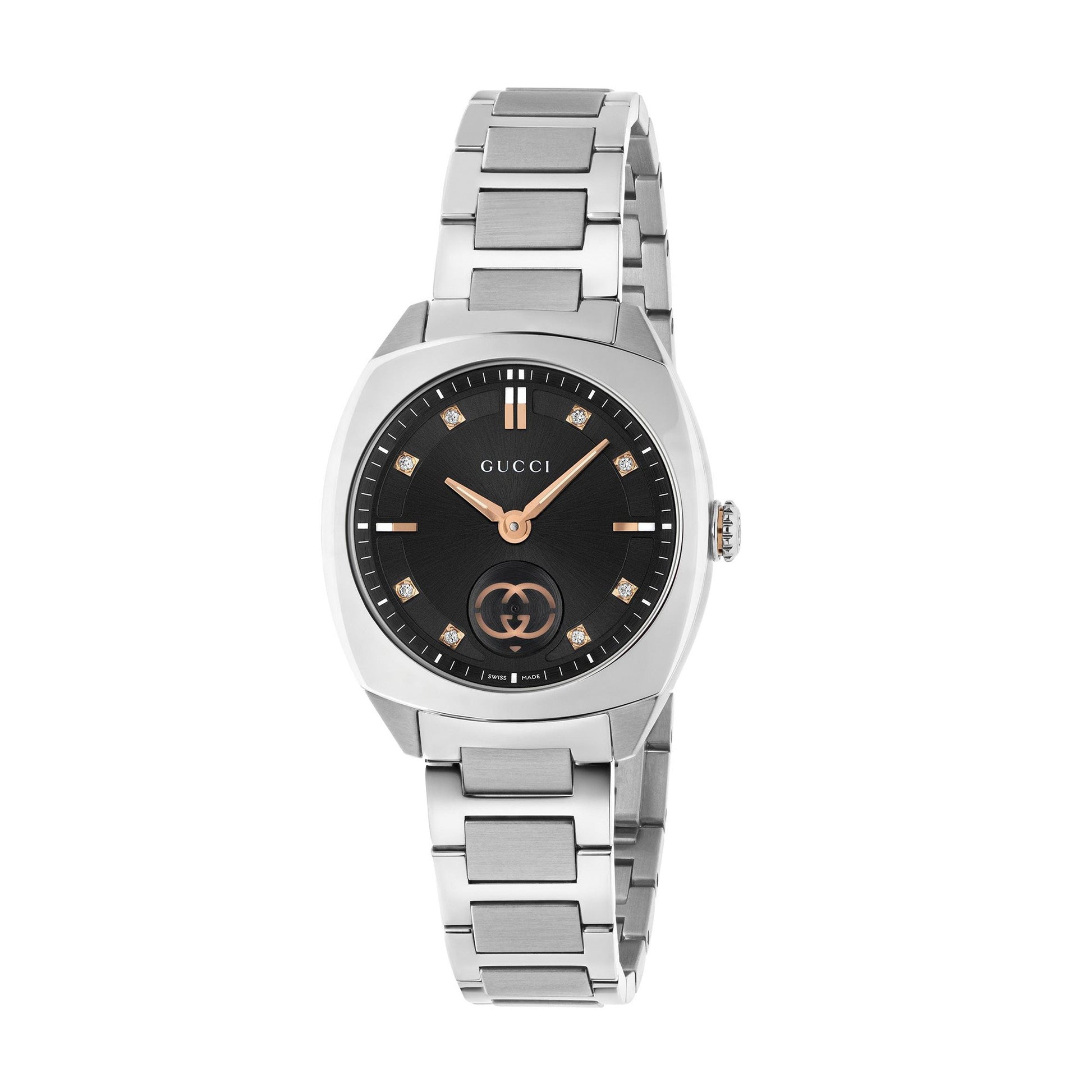 29 mm stainless steel case, black sunbrushed dial with 8 diamonds and pink gold-plated details, Interlocking G small seconds display, stainless steel bracelet, quartz movement