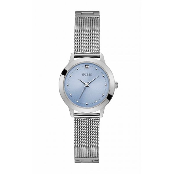A highly fashionable ladies stainless steel strap watch from Guess. Gorgeous stainless steel case holds a pale blue dial, featuring silver tone hands and markers.