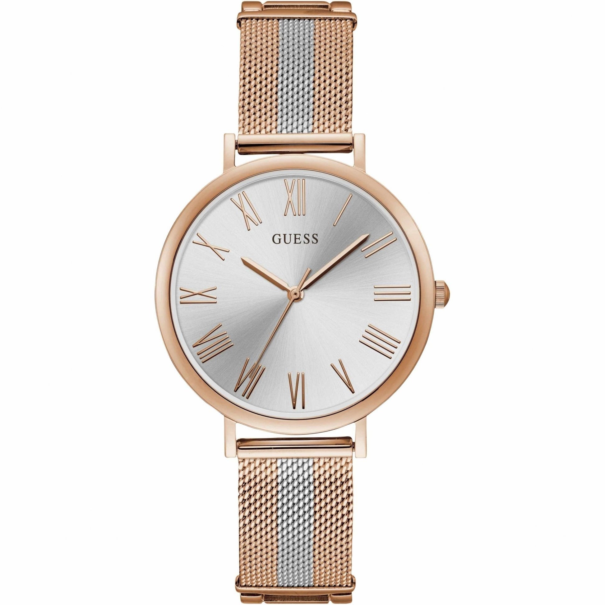 GUESS Ladies watch featuring a polished rose gold case with sunray silver dial and a polished rose gold and silver stripe mesh bracelet, with adjustable G-Links.