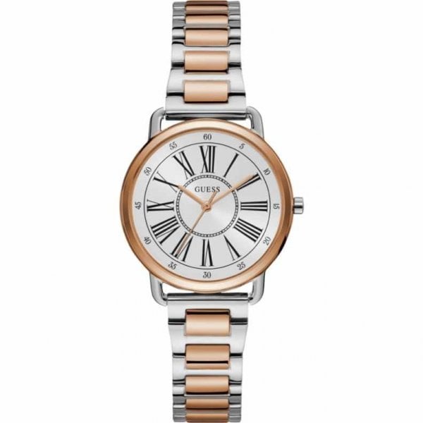GUESS Ladies watch featuring a polished two-tone silver and rose gold bracelet and case alongside a sunray white dial with roman numerals.