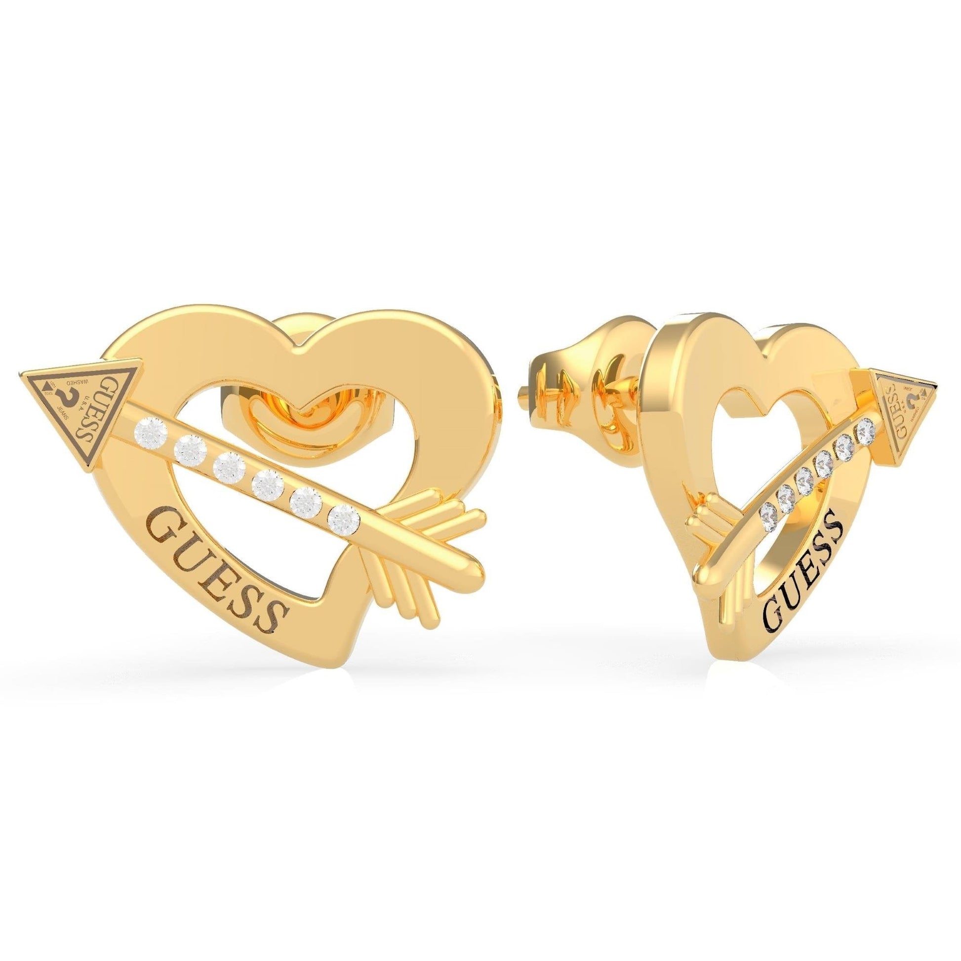 Gold tone heart and arrow stud earrings. With Swarovski® crystals along the arrow.