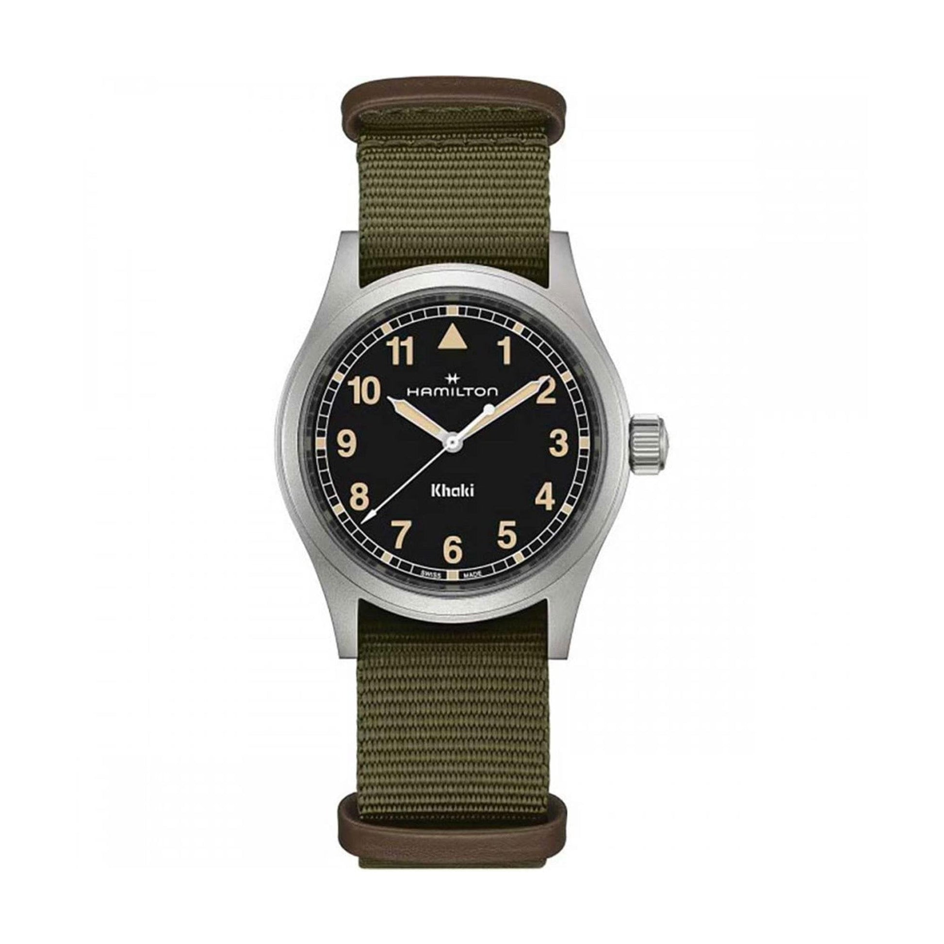 The Khaki Field Quartz expresses a return to Hamilton's military heritage through simplicity in design. The dial features a clear typography with straighter Arabic numerals and a "railway" minute track. The color palette is understated, with its sleek black dial highlighted by old radium-colored Super-LumiNova® indexes. The watch comes with a green textile NATO strap and brown leather loops - perfect for your next adventure out in the field.