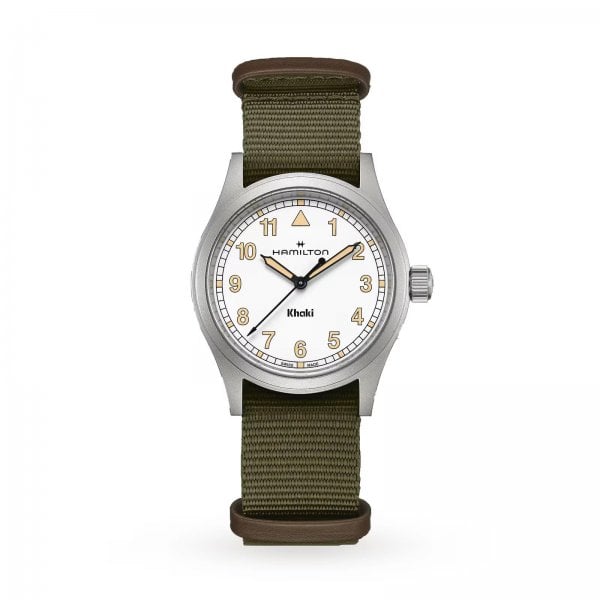 The Khaki Field Quartz expresses a return to Hamilton's military heritage through simplicity in design. The dial features a clear typography with straighter Arabic numerals and a "railway" minute track. The color palette is understated, with its sleek white dial highlighted by old radium-colored Super-LumiNova® indexes. The watch comes with a green textile NATO strap and brown leather loops - perfect for your next adventure out in the field.