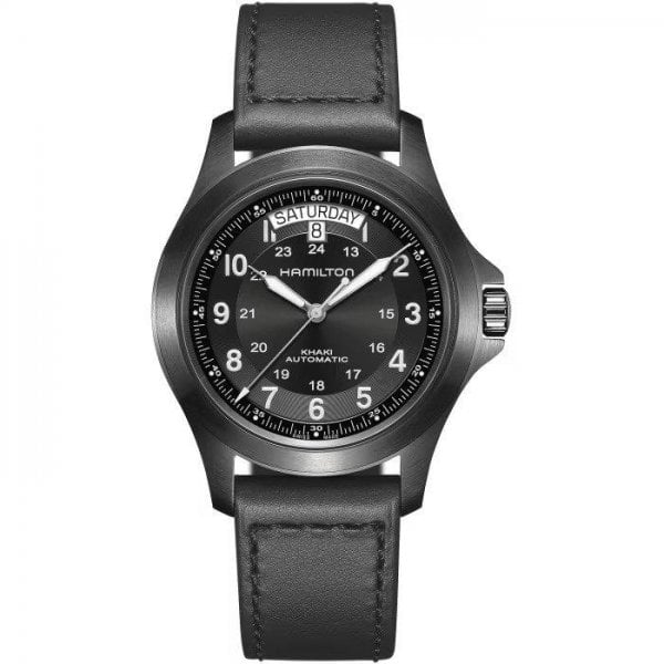 Inspired by Hamiltons military heritage, our field watches are rugged and resilient. Perfect for after-dark heroics, the Khaki Field King Auto features a black PVD-coated case, black dial and black leather strap for the ultimate in stealth style.