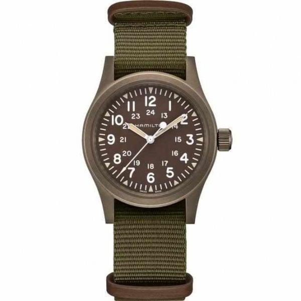 38 mm stainless steel case, three hand display, dark dial with light-colored numerals, triangular indexes with old radium color Super-LumiNova, durable NATO strap: The new Khaki Field Mechanical is a faithful recreation of its original 1960s forebear and is true to Hamiltons military heritage. The original soldiers watch now features Hamiltons unique Earth colored PVD case coating.