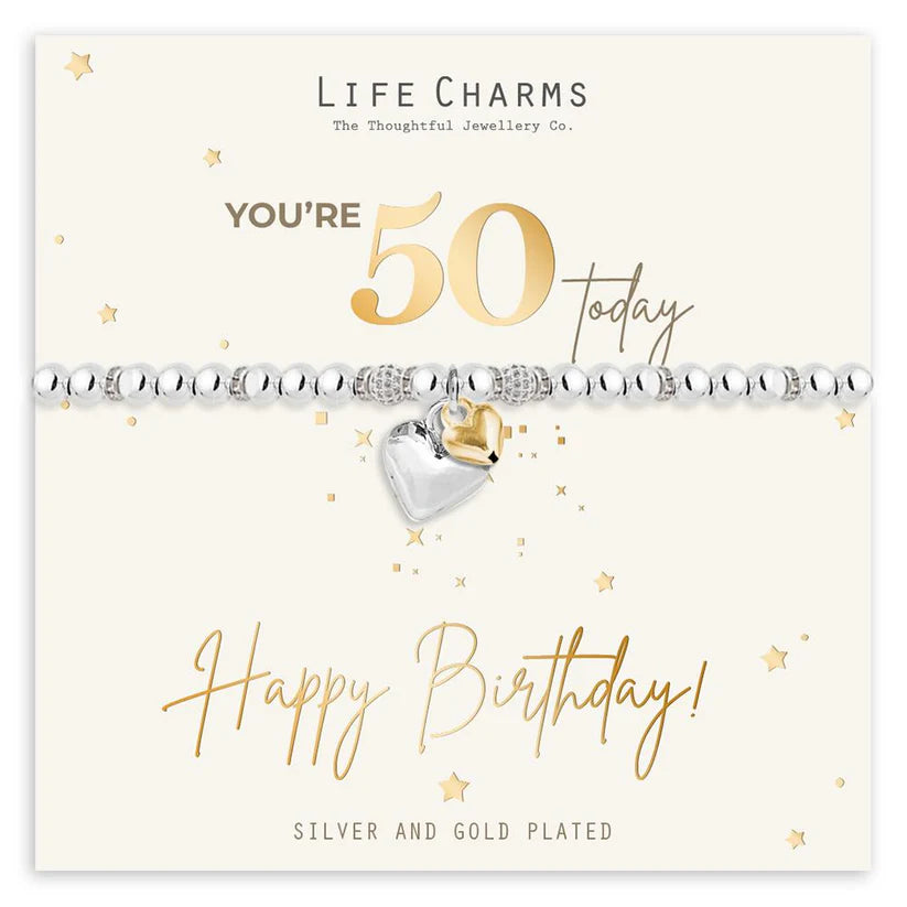Beautiful 50th birthday silver plated bracelet with gold puffed heart charm.