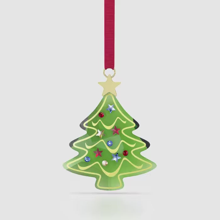 One of the iconic symbols of the holiday season, this ornament is crafted in the shape of a glittering festive tree. Suspended from a red grosgrain ribbon, the shimmering green design is crafted with 254 facets and features gold-tone print and decorations in red, blue and Golden Shadow effect. At the top, the bright star is formed from champagne gold-tone metal. Hang this ornament in a prominent position and let it shine throughout your celebrations. Decoration object. Not a toy. Not suitable for children under 15.