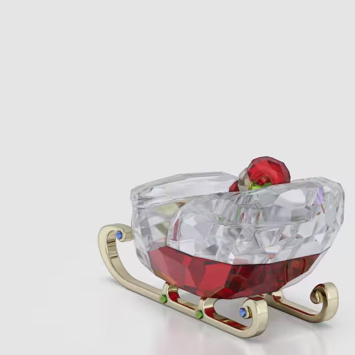 Bring the magic of the holidays into your home with this enchanting Santa sleigh. The red and white figurine is crafted with 489 facets and is decorated with individual crystals in green and blue. Extra special detailing includes the skids in champagne gold-tone metal, as well as the candy cane featuring Swarovski’s Golden Shadow effect. Direct from the night sky, this magical sleigh can be combined with the elf, Santa and gift ornaments to create a joyous scene. Decoration object. Not a toy. Not suitable for children under 15.