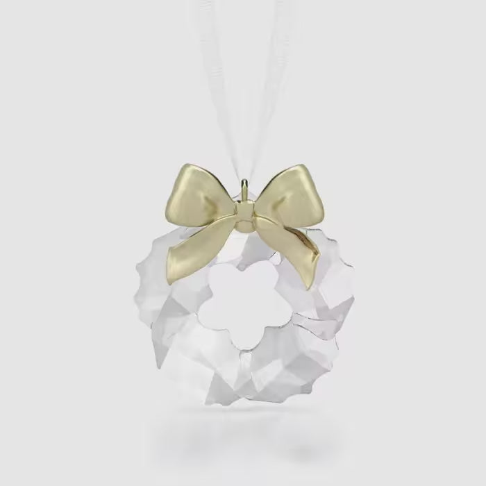 This luxurious wreath ornament provides a timeless symbol of festive elegance. Suspended from a white grosgrain ribbon, the crystallised design features 108 light-reflecting facets, along with a glossy bow in champagne gold-tone metal. Hang it somewhere prominent to evoke feelings of joy and celebration. Decoration object. Not a toy. Not suitable for children under 15.