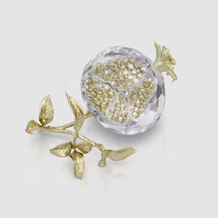 In tribute to one of nature’s most bountiful treats, this stunning pomegranate is a symbol of abundance and prosperity. The body of the fruit is fully crystallised with 116 radiant facets, while at the centre, the design reveals 87 Swarovski Crystal Beads. The Jonquil Golden Shine effect is then used as a special finishing touch, helping to further elevate the design. To complete the luxurious look, the metallic stems and leaves are crafted with a glossy champagne gold-tone finish. This pomegranate closely mirrors the true size of the fruit and makes a perfect table centrepiece at any time of year. Decoration object. Not a toy. Not suitable for children under 15.