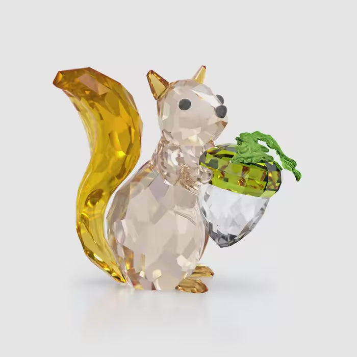Inspired by the Idyllia family, this playful figurine takes cues from the natural world. The scene depicts a fluffy-tailed squirrel holding an acorn and is crafted from 696 facets in a variety of colours with lacquered green metal forming the leaves. Gift this ornament to a nature lover or display within your home for instant charm. Decoration object. Not a toy. Not suitable for children under 15.
