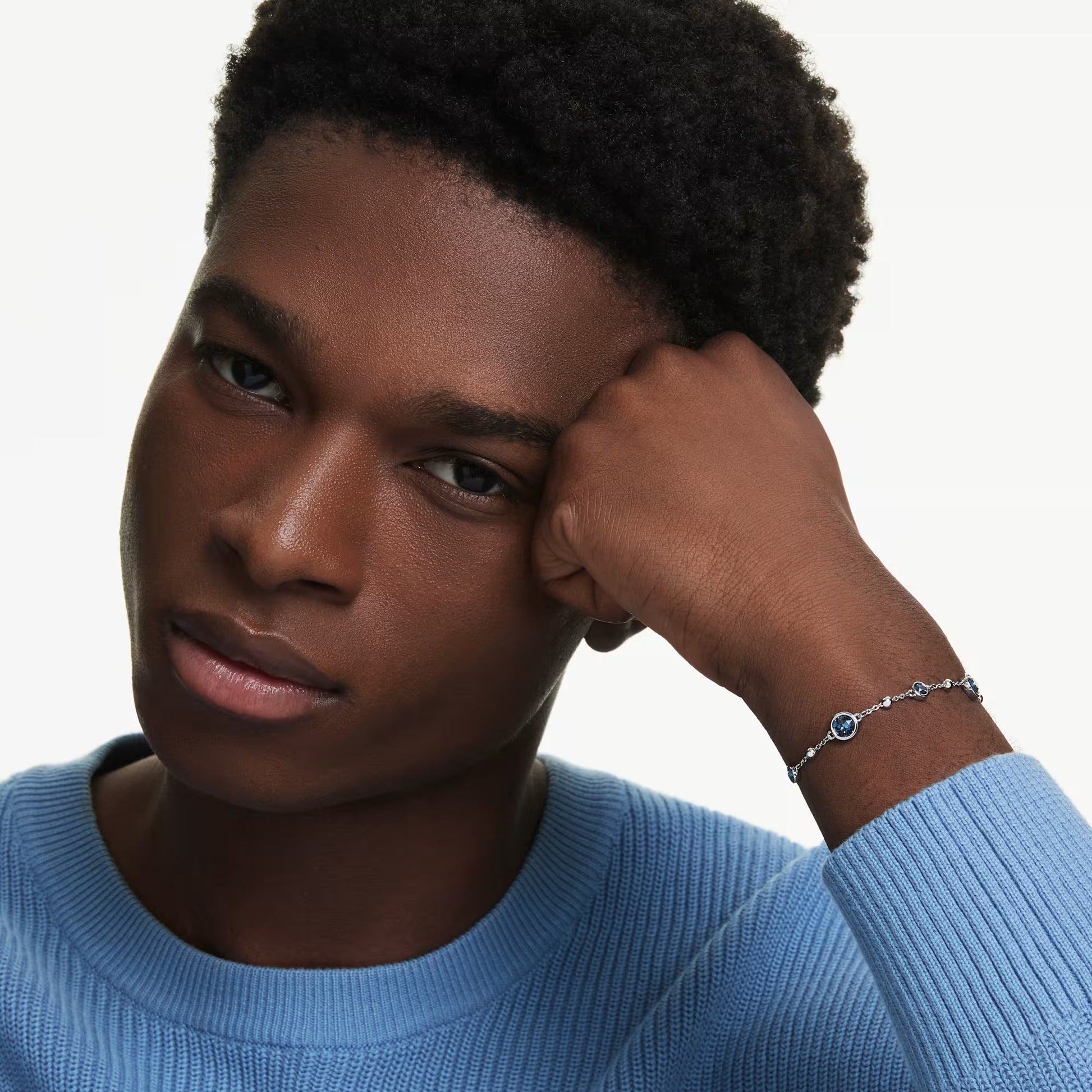 With its dynamic mix of shapes, this Imber bracelet will give your wrist a distinctive glow. The rhodium plated chain features a lobster closure and a strand of metal droplets, interspersed with round blue crystals in a refined bezel setting. The piece also includes an extra elongation, allowing it to fit all sizes. Perfect for adding a soft and graceful touch to an outfit.