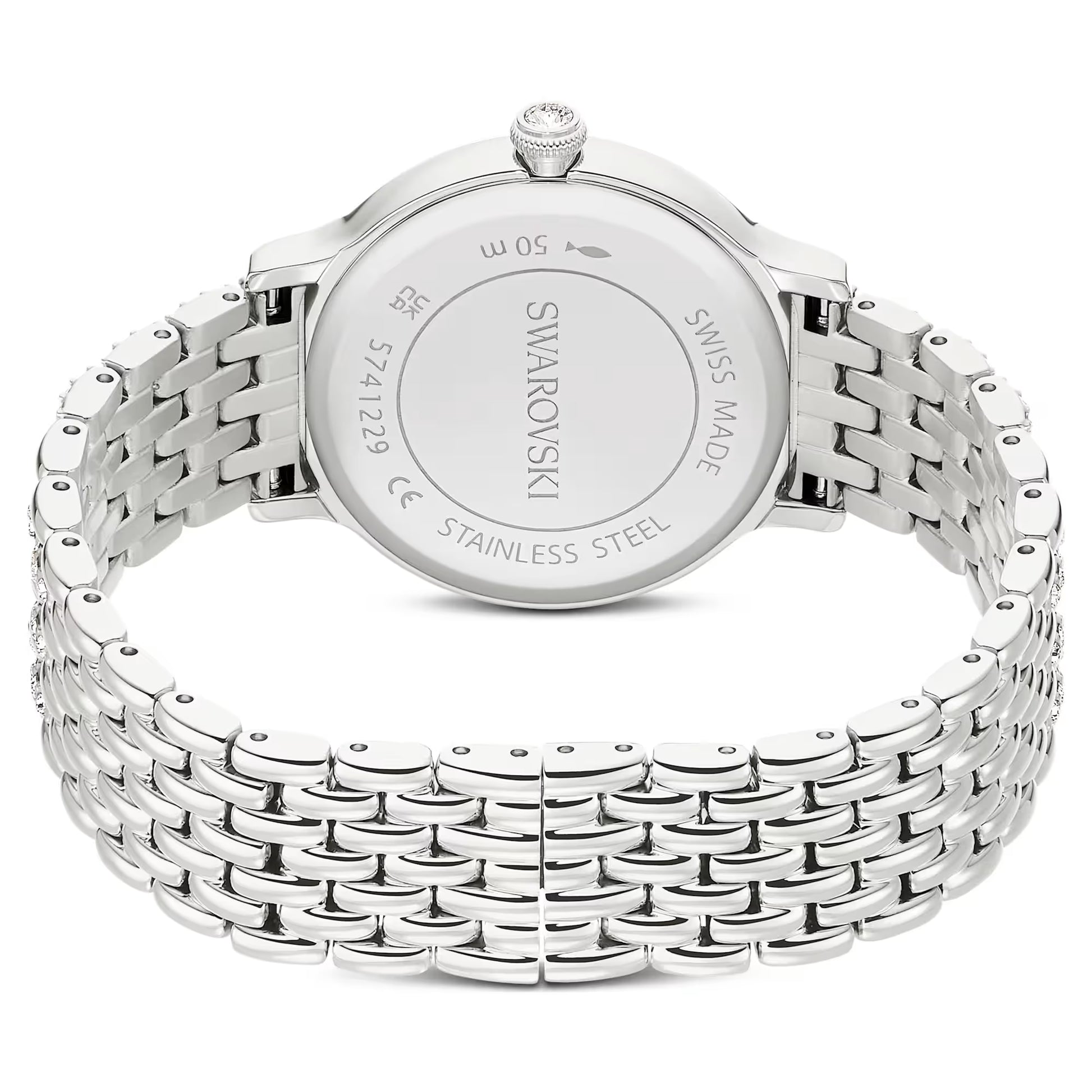 This 31 mm timepiece is crafted in stainless steel and draws inspiration from the fusion of metal and crystals that defines the Imber jewellery family. The pavé bezel is set with 68 individual crystals, while another 198 crystals are used to decorate the seven-link bracelet. Extra radiance can be found on the sunray dial, with its gleaming surface accentuated by crystal index markers, while a sophisticated Swan emblem is placed at 12 o’clock. A choice that exudes glamour, this Swiss Made watch is water-resistant to 50 m.