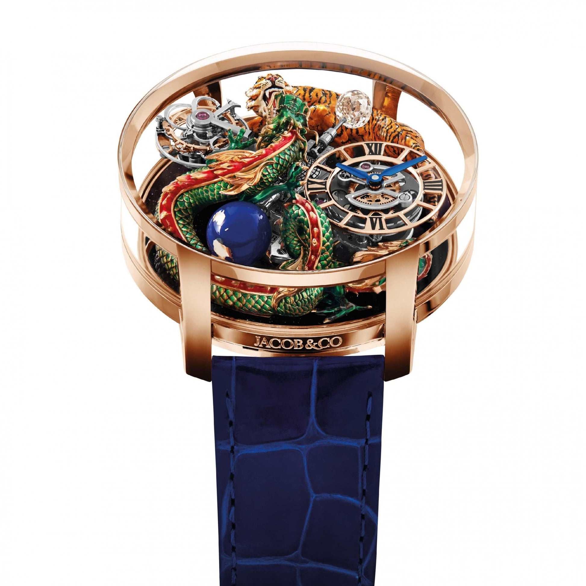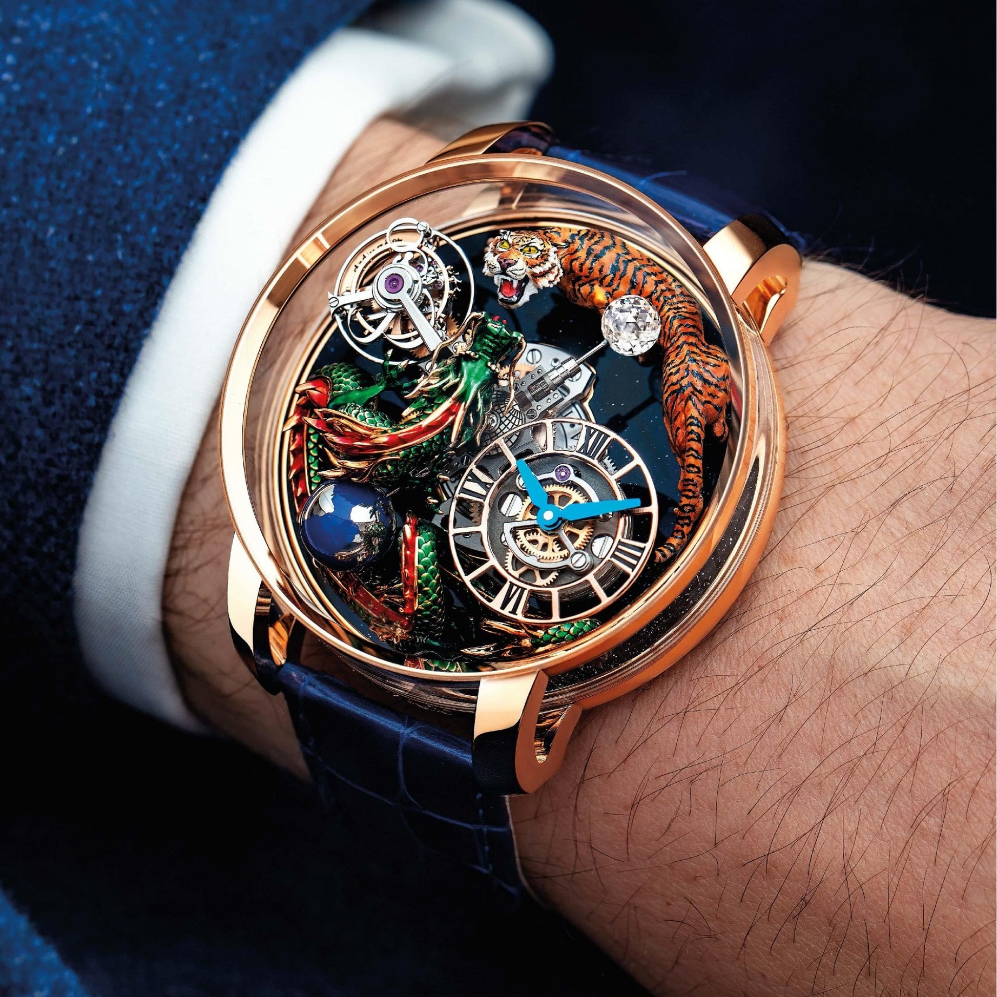 The movement is surrounded by Rose Gold Hand-engraved and Handpainted Tiger and Dragon.