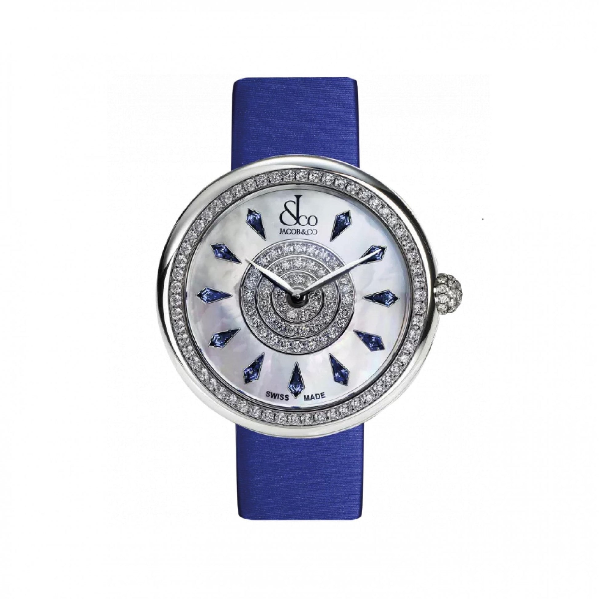 Dial: White Mother of Pearl Set with 11 ICY Blue Sapphires Hours; Dial Center Pavé Set with 50 Round White Diamonds( 0.66ct.); Hands: Leaf.