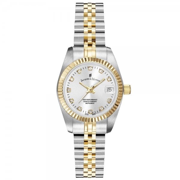 26mm dial & adjustable silver and gold strap Jewels on the dial at each hour location Swiss quartz movement Built in date display 50 metre water resistant Official 2 Year Jacques Du Manoir warranty