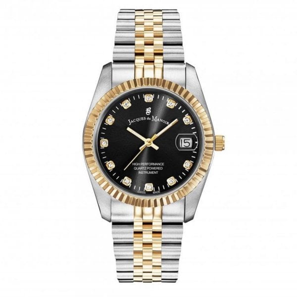 36mm dial & adjustable strap Black dial with jewels in hour marker position Swiss made & built in date display 50 metre water resistant Official 2 Year Jacques Du Manoir Warranty